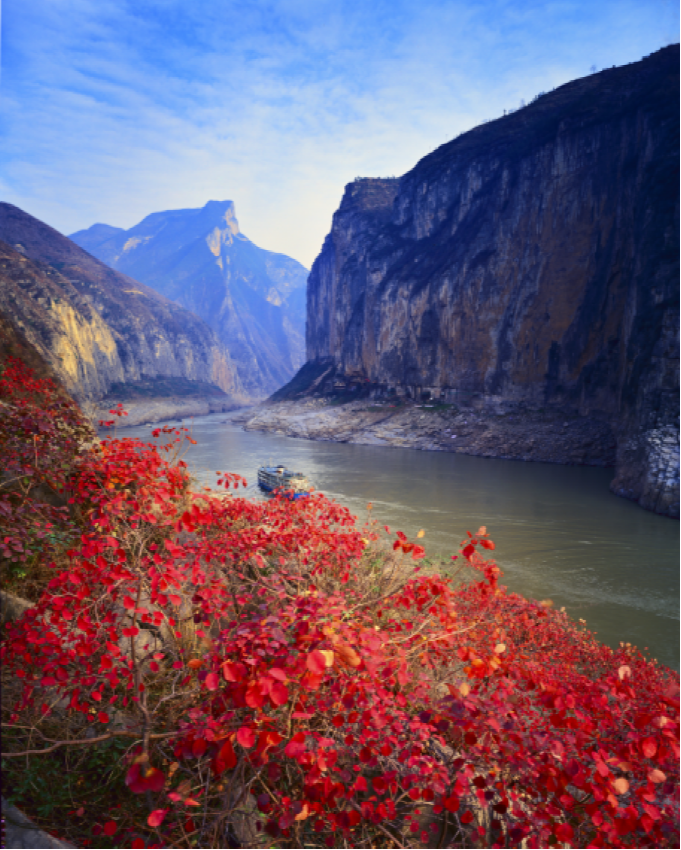 溝通巴蜀與中東部的長江上游段,俗稱川江,或稱蜀江,一般指四川宜賓至湖北宜昌之間的河段,全長約1030公里。重慶以上的370公里為上川江,重慶以下的660公里稱為下川江,下川江流經丘陵和高山峽谷地區落差120米的三峽地區,因兩岸山巒夾峙,水流急湍,所以又有“峽江”之稱。詩圣杜甫詩云——“高江急峽雷霆斗,古木蒼藤日月昏”,描繪的就是三峽的險峻。
