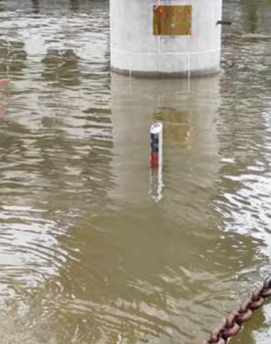 ▲?2020 年 7 月 5 日下午,在長江水文武漢關水位觀測點,長江不斷上漲的洪水,直逼 27.30 米的警戒水位標識牌。圖片來源:視覺中國