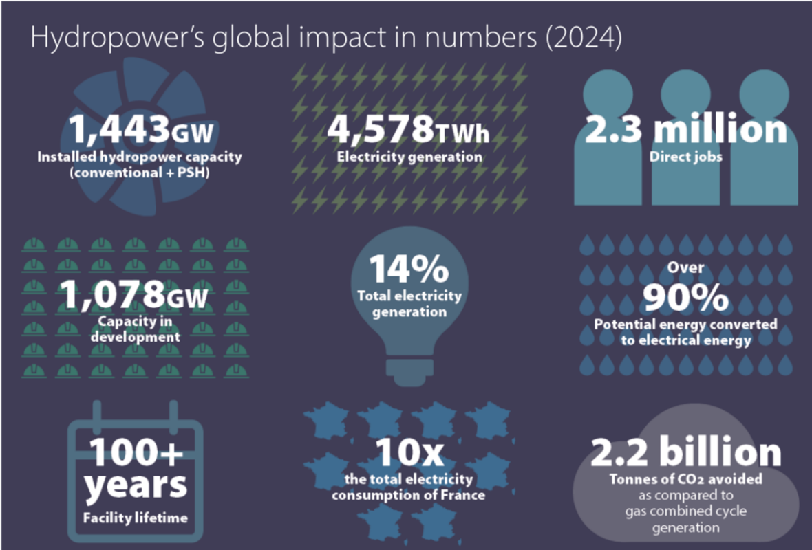 2024年,全球新增水電裝機(jī)容量排名前五的國(guó)家依次為中國(guó)、坦桑尼亞、埃塞俄比亞、不丹和巴基斯坦;全球水電發(fā)電量相當(dāng)于法國(guó)總電力消費(fèi)量的10倍,與燃?xì)饴?lián)合循環(huán)發(fā)電相比,相當(dāng)于減排二氧化碳22億噸;水電行業(yè)為全球提供了超過(guò)230萬(wàn)個(gè)就業(yè)崗位。