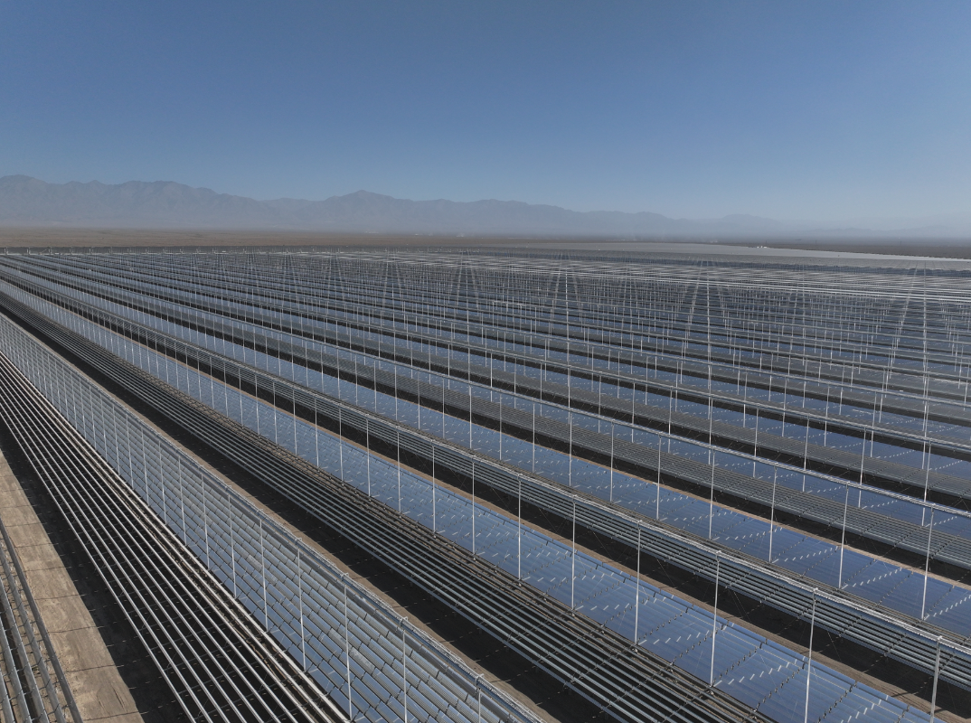 隔得太遠(yuǎn),看得并不真切。終于,在距離目的地越來越近時,答案得到了揭曉——那并不是湖,而是三峽能源哈密百萬千瓦“光熱+光伏”一體化綜合能源示范項(xiàng)目基地。放眼望去,一排排整齊劃一的銀色反射鏡映襯著藍(lán)天白云,如一片荒漠沙地上的“藍(lán)色湖泊”,在陽光下熠熠生輝。